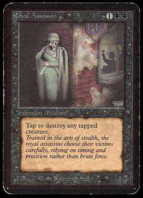 ‘Royal Assassin’ from Alpha in Played (PL) condition. Considerable border wear, with a surface dent on the lower left part of the card face, but a great piece of Magic history.