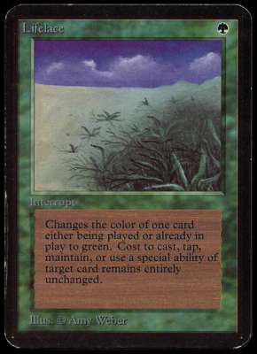‘Lifelace’ from Alpha in Light Play (LP) condition. Heavy border wear is present on the left edge, seen clearly on first inspection. Otherwise, the card is in decent condition with typical age-related surface and edge wear.