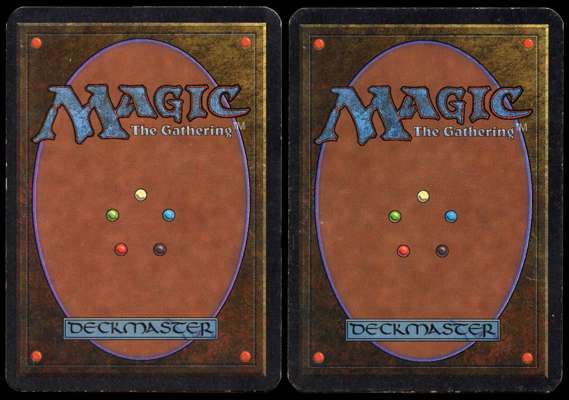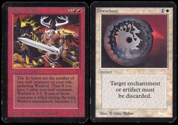 ‘Disenchant’ and ‘Keldon Warlord’ from Alpha. The Disenchant is in Poor (PO) condition. While the card generally looks quite good, it has suffered from a binder related mishap in which it has developed a bend/crease all the way down on the left side. The Keldon Warlord is Good (GD) condition, with very typical border wear and light scratches, but is otherwise a fantastic looking card.