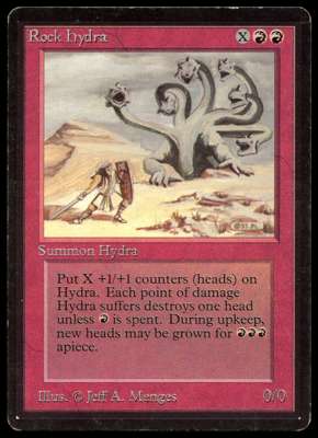 ‘Rock Hydra’ from Beta in Light Play (LP) condition. This card has typical border bear, with a few dings on the top edge. Both surfaces have light abrasions/scratches with some dirt on the front.