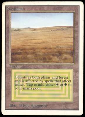 "Savannah' from Unlimited in Poor (PO) condition. This card has likely received some water damage over the years and has been inked around the back's upper right corner and on the rear surface, presumably to hide said damage. Despite this considerable damage and other surface and borer wear, this card is likely still sleeve playable, perfect for your commander decks.
