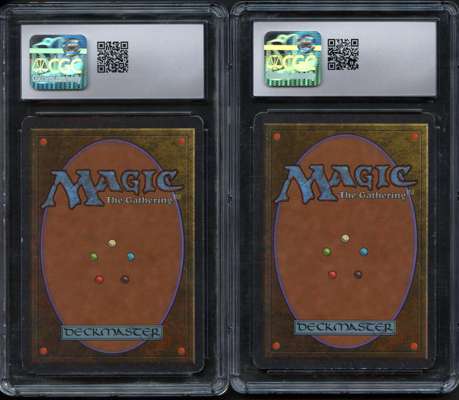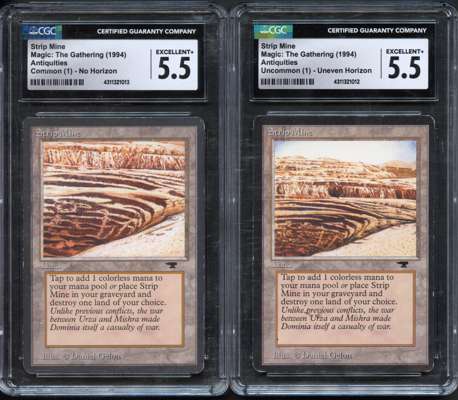 A CGC 5.5 graded Strip Mine (Version 2.) and a CGC 5.5 graded Strip Mine (Version 3.) from the Antiquities set.