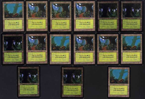 This lot features 15 basic Forests from Beta edition. collecting all three artworks from the edition the cards all range in condition from Good to Played. A perfect way of getting Beta lands before your next draft!