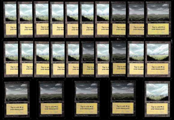 This lot features 25 basic plains from Beta edition. collecting all three artworks from the edition the cards all range in condition from Good to Played however the vast majority are Played with one or two coming in as damaged. A perfect way of getting Beta lands before your next draft!