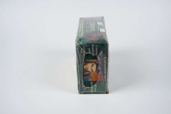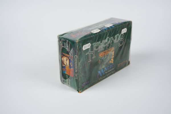 A factory sealed booster box of Homelands all the way from 1995. This set is one of the all time ‘meme’ Magic sets, however it is still incredibly rare to find as a sealed booster box. The box has two of its original pricing stickers in addition to some signs of wear and crushing, with some rips in the plastic wrap that occur naturally in a 30 year old box.
