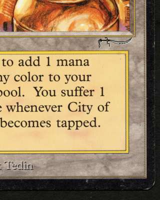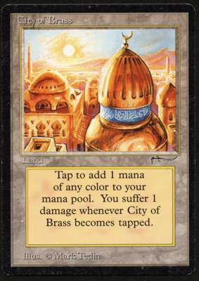This City of Brass from Arabian Nights is in Good condition, the TCG Player equivalent would be Moderate Play. It has light edgewear around the back of the card, a light scratch and minor scuffing. This would make a fantastic edition to any old school deck.