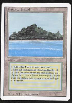 Magic: The Gathering Tropical Island Revised, a dual land card from the 1994 Revised Edition. Providing both Island and Forest mana, it is a highly sought-after card for vintage and Commander decks. In near mint condition, it has minimal signs of handling, making it a valuable piece for collectors and competitive players.