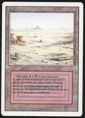 Magic: The Gathering Badlands Revised, a dual land card from the 1994 Revised Edition. Providing both Swamp and Mountain mana, it is a highly sought-after card for vintage and Commander decks. In near mint condition, it has minimal signs of handling, making it a valuable piece for collectors and competitive players.