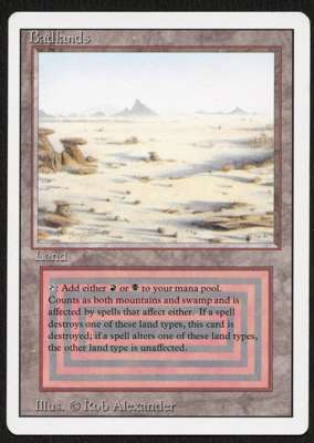 Magic: The Gathering Badlands Revised, a dual land card from the 1994 Revised Edition. Providing both Swamp and Mountain mana, it is a sought-after card for vintage and Commander decks. In light play condition, it shows minor signs of handling while maintaining strong collectible and gameplay value.