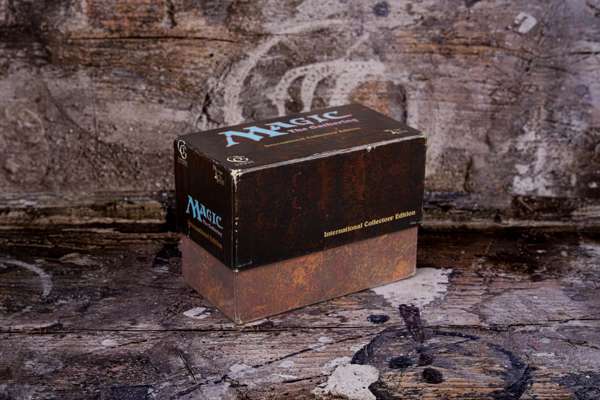 Magic: The Gathering 1993 International Collector's Edition, a special limited-edition set featuring all 302 cards from the original Alpha and Beta releases. These cards have square corners and a gold-bordered back, distinguishing them from tournament-legal versions. Released as a collectible set, it remains a highly sought-after piece of Magic: The Gathering history.