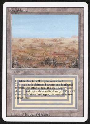 Magic: The Gathering Scrubland Revised, a dual land card from the 1994 Revised Edition. Providing both Plains and Swamp mana, it is a valuable card for vintage and Commander decks. In light play condition, it shows minor signs of handling while maintaining strong collectible and gameplay value.