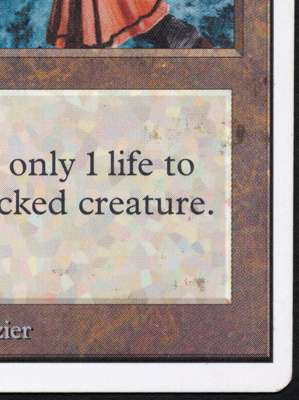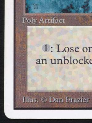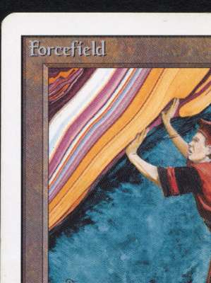 This copy of Forcefield from unlimited is only graded in poor condition because of a very light ring binder crease. It does display the following imperfections, some light surface scracthes on both sides of the card and some dirt blotches - it was clear that the owner loved this card!