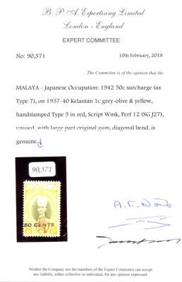 1942 Sunagawa Seal on Kelantan 50c on 1c grey-olive and yellow, large part o.g., very fine save for a light diagonal bend. Rare. BPA Certificate (2018). SG J27, £2500