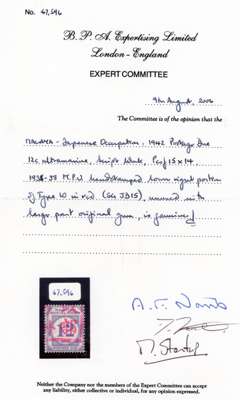 MALAYA JAP OCC 1942 SG JD15 12c Due Malacca Chop mint