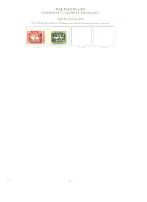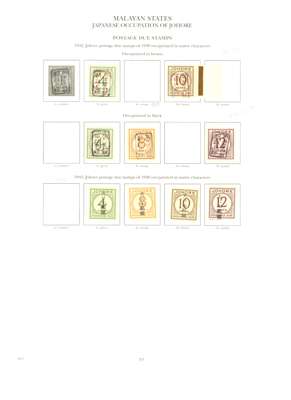 Postage Dues. Johore with Chops; 4c brown (one shortish perf, SG sales card), 4c black (minor toned spots, SG sales card), 8c black (unmounted, SG sales card), 10c brown (unmounted, signed Rowell, SG sales card) and 12c black; 4c - 12c overprints. Also Trengganu 1c Chop E and 4c Chop F, each in black with SG sales card, the latter with dark gum. SG JD2/5, 7-10, 17-18, £543