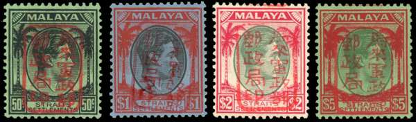 1942 Straits 50c, $1, $2 and $5, Chop B in red save the $1, which has Chop C. The 50c and $5 with hinge remainders, otherwise fine. SG J157-160, £780