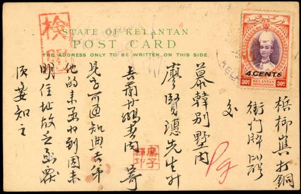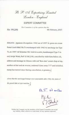 1942 Kelantan 30c violet and scarlet, surcharged ‘4 CENTS’, with Sunagawa Seal, used on 1937 Kelantan postal stationery card. Three Censor marks, two on the front. Faint ‘Gone away 17/7’ endorsement at top. BPA Certificate (2025) observes that the ‘stamp has moved since/during cancellation’. A very rare stamp. SG J18, £3000 off cover