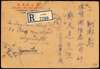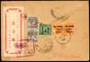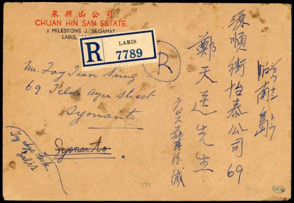 1943 registered envelope from Labis to Singapore bearing (on reverse) 8c vertical pair with Chop C in red, Straits DAI NIPPON 2602 2c pair and Selangor 2c DAI NIPPON 2602. tied by 25 MY CDSs. Johore Bahru transit and Singapore arrival CDSs, red registration seal tied by purple Censor Chop. Ex Rowell