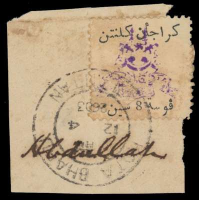 1943 8c purple and black used on piece, tied by Kota Bahru CDS (Proud D10) of 12 4 2603. Somewhat soiled, but very scarce genuinely used. SG TK4, £400