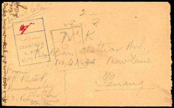 1944 8c carmine on reverse of envelope to Penang. The stamp has evidently been subjected to some sort of (gum?) permeation, or possibly oxidisation, which has mostly affected the design rather than the borders. Tied by a faint but decipherable Alor Star datestamp. The front with two censor marks, one numbered ‘7’ in Japanese script, the other bilingual Thai/English CENSORED/ G.P.O./ ALOR STAR, the latter initialled in red. An interesting commercial envelope