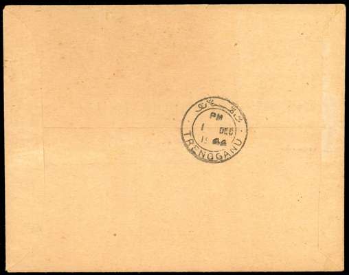 1944 (1 DEC) locally addressed cover bearing1943 pictorial 2c pale emerald, 3c drab 4c carmine-rose and 50c blue, each with type TT1 'TRENGGANU' all in BLOCKS OF FOUR centrally cancelled by ‘Kuala Trengganu’ dated ‘1 DEC’ (the earliest recorded date) and backstamped with the same postmark on the same day. Faint toning mentioned for accuracy, still a very fine and rare multiple franking, with few known covers from this issue, particularly in this condition. SG TT20/2, TT27 cat £6,700