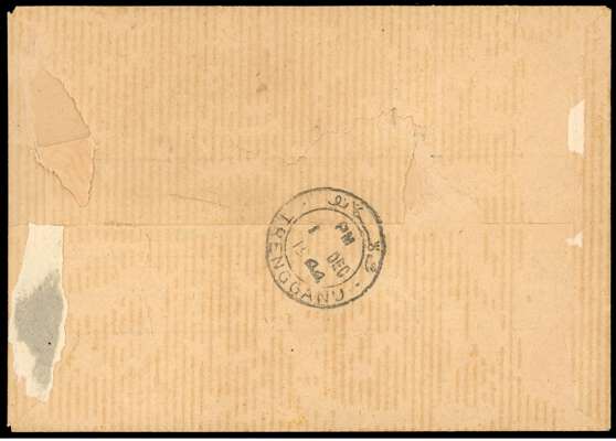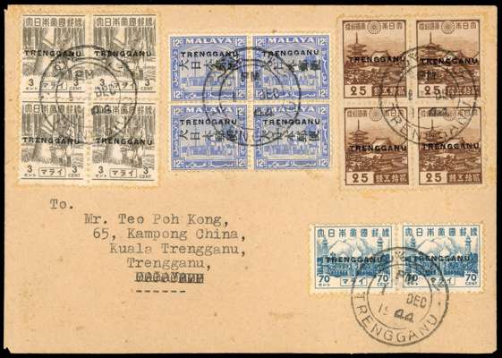 1944 (1 DEC) locally addressed cover bearing Japan 25s brown and chocolate, Selangor 12c bright ultramarine with type 2 opt (L to R) 1943 pictorial 3c drab and 70c blue, and each further opt with type TT1 'TRENGGANU' all in BLOCKS OF FOUR but for the 70c blue which is a horizontal pair, centrally cancelled or tied by ‘Kuala Trengganu’ dated ‘1 DEC’ (the earliest recorded date) and backstamped with the same postmark on the same day. Minor damage and adhesion to back from previous mounting (Clear of backstamp) and minor toning, still a desirable cover- the 70c in used condition exceedingly rare. SG TT15, TT21, TT28, TT33 cat £6,800
