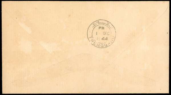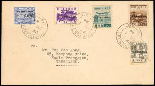 1944 (1 DEC) locally addressed cover bearing 1943 pictorial 3c drab and 15c violet, Selangor 12c bright ultramarine with type 2 opt (L to R) and Japan 25s brown and chocolate and 30s blue-green, each with type TT1 'TRENGGANU' opt, tied by by ‘Kuala Trengganu’ cds dated ‘1 DEC’ (the earliest recorded date) and backstamped with the same postmark on the same day. Peripheral toning and minor damage to reverse from previous mounting (clear of backstamp) still a scarce cover from the issue. SG TT15, TT21, TT25, TT33, TT34 cat £1,575