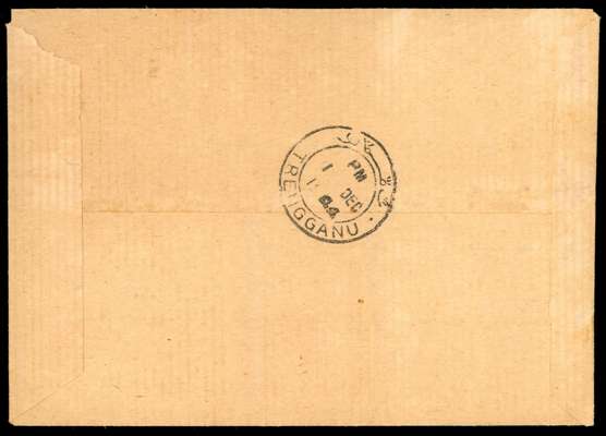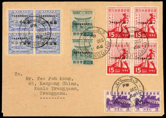 1944 (1 DEC) locally addressed cover bearing Japan 30s blue-green vertical pair, 1943 pictorial 15c violet horizontal pair Selangor 12c bright ultramarine with type 2 opt (L to R), and Savings campaign 15c scarlet in blocks of four each further opt with type TT1 'TRENGGANU' centrally cancelled (blocks) or tied by ‘Kuala Trengganu’ dated ‘1 DEC’ (the earliest recorded date) and backstamped with the same postmark on the same day. A desirable and attractive combination franking. SG TT15, TT25, TT30, TT34 cat £3,650
