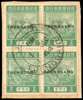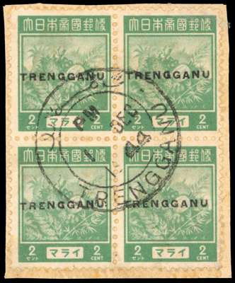 1944 (1 Oct) 2c pale emerald (1943 pictorial) with type TT1 'TRENGGANU' opt, block of four on piece, very fine used with complete Kuala Trengganu cds dated ‘1 DEC’, the earliest recorded date. Very rare indeed as a block of four, with less than 20 of this stamp known to us, all of which are used. SG TT20 cat £1,500