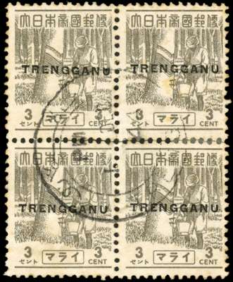 1944 (1 Oct) 3c drab (1943 pictorial) with type TT1 'TRENGGANU' opt, block of four on piece, very fine used with complete Kuala Trengganu cds dated ‘1 DEC’, the earliest recorded date. Split perfs at right neatly reinforced with hinge, minor peripheral toning. Scarce. SG TT21 cat £1,100