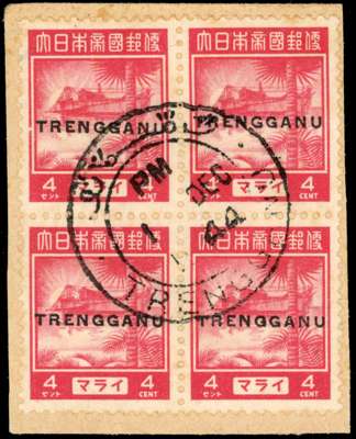 1944 (1 Oct) 4c carmine-rose (1943 pictorial) with type TT1 'TRENGGANU' opt, used block of four with complete Kuala Trengganu cds dated ‘1 DEC’ the earliest recorded date. Faint peripheral toning at top, still a highly desirable multiple. SG TT22 cat £1,500