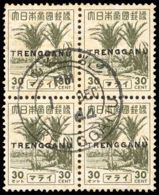 1944 (1 Oct) 30c olive-green (1943 pictorial) with type TT1 'TRENGGANU' opt, used block of four centrally cancelled by complete Kuala Trengganu cds dated ‘1 DEC’, the earliest recorded date. Very faintly toned, still a very rare multiple which accounts for over 10% of the recorded used examples! SG TT26 cat £1,200