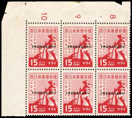 1944 (1 Oct) 15c scarlet "Savings Campaign" with type TT1 "TRENGGANU" opt, upper left CORNER BLOCK OF SIX, unmounted o.g. showing ‘10’, ‘9’ and '8' row guides, Pin holes, creasing and minor blemishes in margin only, mentioned for accuracy as this is the sole known corner block, with mint multiples of any Trengganu overprints exceedingly rare. SG TT30 cat £5,700
