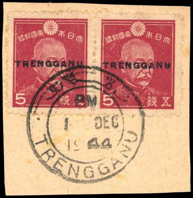 1944 (1 Oct) Japan 5s claret with type TT1 'TRENGGANU' opt, horizontal pair tied to piece by complete Kuala Trengganu cds dated ‘1 DEC’ the earliest recorded date. By some distance the finest recorded examples of this excessively rare stamp, which the recent census has revealed is underrated in part 1. SG TT32, £2,000