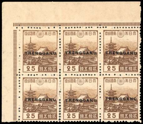 1944 (1 Oct) Japan 25s brown and chocolate (no. 326) with type TT1 'TRENGGANU' opt, upper left CORNER BLOCK OF SIX, part to large part o.g. never mounted but with gum disturbance, backing adhesion and perfs split vertically between columns one and two, still a spectacular multiple of the highest rarity which contains 50% of the recorded mint examples, unique in this form. SG TT33 cat £5,600