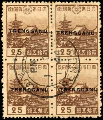 1944 (1 Oct) Japan 25s brown and chocolate (no. 326) with type TT1 'TRENGGANU' opt, block of four, centrally cancelled by Kuala Trengganu cds dated ‘1 DEC’ the earliest recorded date. A scarce stamp, particularly in this choice form and condition. SG TT33 cat £1,200