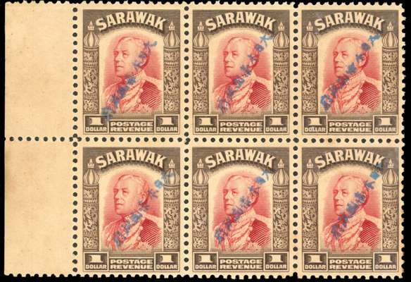 1942 $1 scarlet and sepia, type 1 h/s in blue (diagonal), left marginal block of 6 (3x2), mint, o.g., somewhat toned and the gum rather dry but believed to be the largest block extant of the Sibu printing. SG J21b, cat £4500