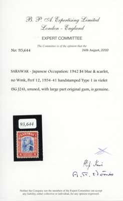 Japanese Occupation. 1942 $4 blue and scarlet with violet handstamp, large part o.g. BPA Certificate (2020). SG J24, £425