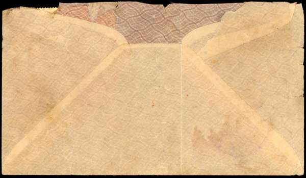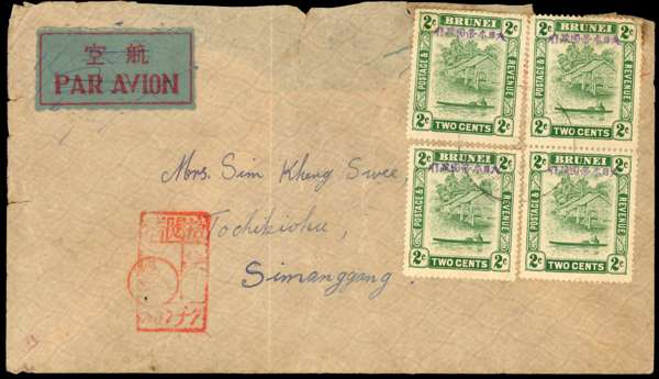 1943 (c.) airmail cover to Simanggang, franked by Brunei 1942-44 2c green (4, a vertical pair and two singles = SG J2), tied by very light type JD2 cds (believed to be Kuching), with censor mark at lower left; the envelope with vertical fold and flap missing, but an extremely scarce franking.