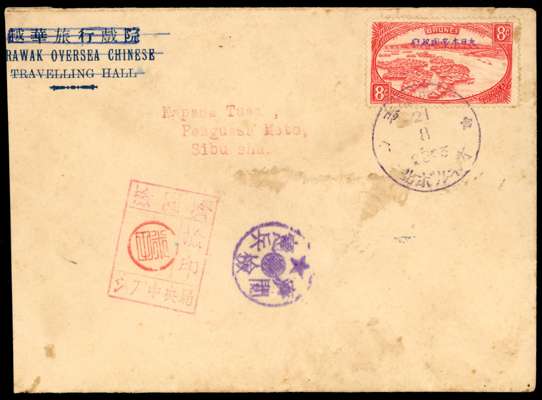 1943 (21 Aug) locally addressed cover bearing Brunei 1942-44 8c red (= SG J10), tied by mostly fine strike of Sibu type JD3 ‘Japanese’ cds, with censor marks at left; a few marks (mainly on reverse) and envelope slightly reduced at left, still above average.