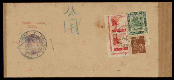 1944 (18 May) cover (recycled “O.H.H.S.” envelope) from Kapit to Sibu, bearing Brunei 1942-44 3c blue-green (= SG J4) and Japan 1s and 10s (vertical pair from lower left corner), tied by Kapit type JD3 ‘Japanese’ cds with circular “SEAL OF KAPIT / SARAWAK” cachet at lower left, minor marks still fine and rare.