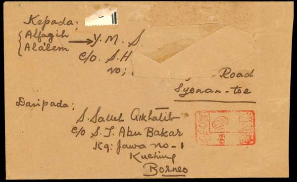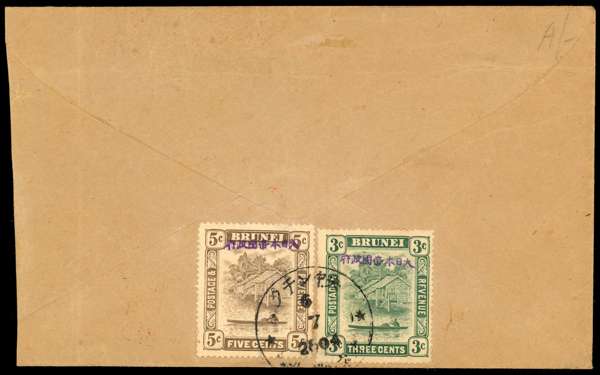1944 (6 July) cover from Kuching to Singapore, bearing (on reverse) Brunei 1942-44 3c blue-green (= SG J4) and 5c chocolate (= SG J6), tied by Kuching type JD3 ‘Japanese’ cds, with censor mark on face; the address partly excised otherwise a fine usage.