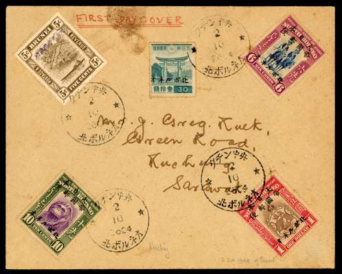 1944 (2 Oct) locally addressed cover with typed endorsement “FIRST DAY COVER”, bearing North Borneo 1944-45 opt on Japan 30s (= SG J46) in combination with Brunei 1942-44 5c (= SG J6) and North Borneo 1944 6c, 10c, $1 (= SG J24, J26, J32), all tied by four strikes of Kuching type JD4 ‘Japanese’ cds, minor traces of toning otherwise fine and scarce.
