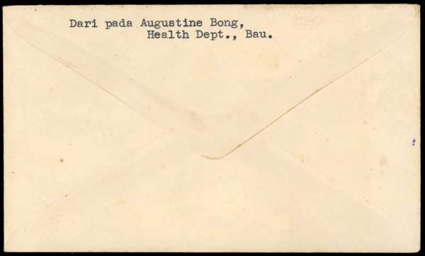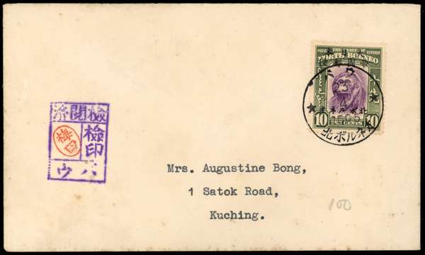 1945 (23 Apr) cover from Bau to Kuching, bearing 1944 (30 Sep) 10c violet and bronze-green, tied by very fine Bau type JD3 ‘Japanese’ cds with censor mark at left, fine and most attractive.