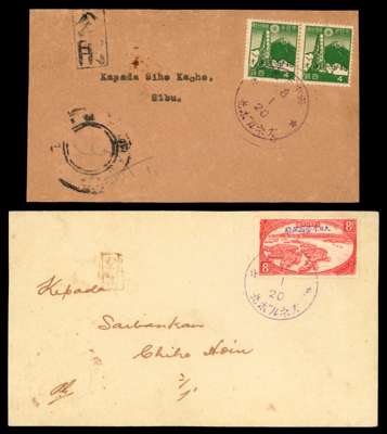 1945 (8 Jan) locally addressed front bearing North Borneo 1944-45 opt on Japan 4s yellow-green pair, tied by Sibu type JD3 ‘Japanese’ cds, showing year date as “20” instead of “2605”, with censor mark and official cachet at left, plus a similar front to Sandakan bearing Brunei 1942-44 8c red, tied by “18 1 20” cds; a fine pair, the first ex Rowell (CRL 28 Oct 1992, lot 1128).