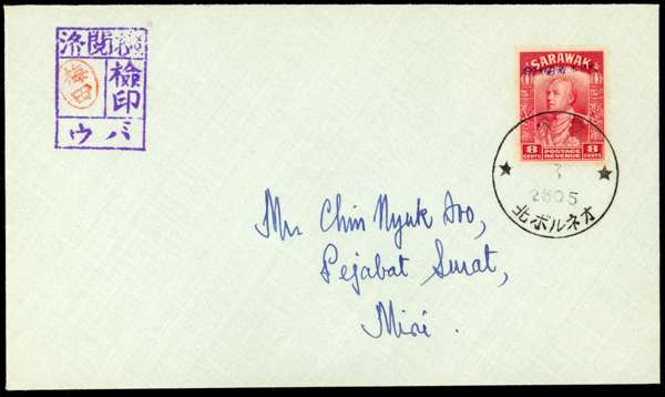 1945 (Mar) ‘Foo’ cover from Bau to Miri, bearing 1942 8c carmine, tied by mostly fine strike of Bau type JD3 ‘Japanese’ cds with censor mark at left, a fine philatelic usage. SG J11.