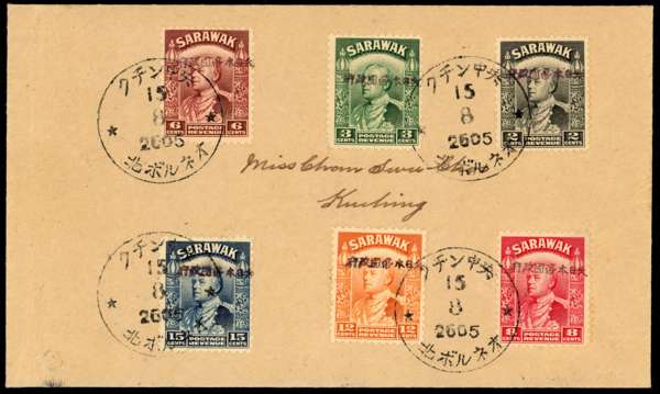1945 (15 Aug) locally addressed philatelic cover bearing 1942 2c black, 3c green, 6c lake-brown, 8c carmine, 12c orange, and 15c blue, all with black opt, tied by four strikes of Kuching type JD4 ‘Japanese’ cds, a very fine and interesting cover, the 12c and 15c currently unlisted with black overprint. SG J3a, J5a, J9a, J11a, J14 var, J16 var