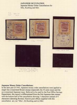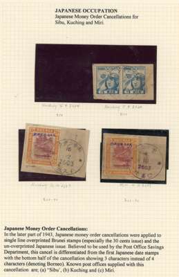 Money Order Cancellations. Small group neatly arranged on two pages comprising Brunei 6c greenish grey and 30c purple and orange-yellow (6), and Japan 15s ‘pilot’ horizontal pairs (2), variously cancelled at Sibu, Kuching and Miri, typically mixed condition still useful with mostly fine strikes. (9)