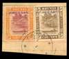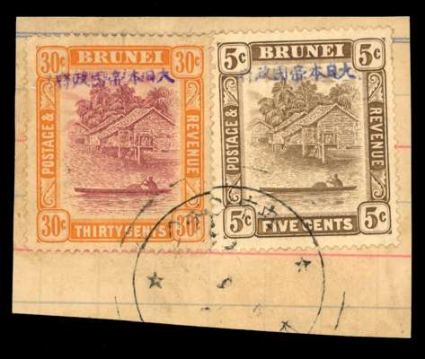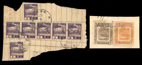 Small range of type JD3 ‘Japanese’ cancels from Sibu and Kuching, mostly tying Brunei 1942-44 stamps to piece (noted 30c in combination with 5c) plus unoverprinted Japan 8s (9, on two pieces), mixed condition (11)