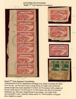 Nine examples (all but one on piece) of Brunei 1942-44 8c red (= SG J10) including a vertical strip of 6, each with good to fine strikes of Kapit type JD3 ‘Japanese’ cds, also Japan 4c yellow-green pair tied to piece by the same cancel, condition varies but generally above average.